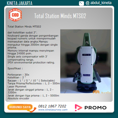 Jual Total Station Minds MTS-02 dan lengkapi peralatan pengukuran, penelitian atau pekerjaan survey anda dengan ukur Total Station SOKKIA Harga kompetitif Tentunya Gratis antar untuk Area Jakarta dan dapat dikirim keseluruh Indonesia, Jika membutuhkan penawaran harga hubungi sales kami Email abdul.kineta@gmail.com dan Telp 0812.18677202 / 0815.11144200